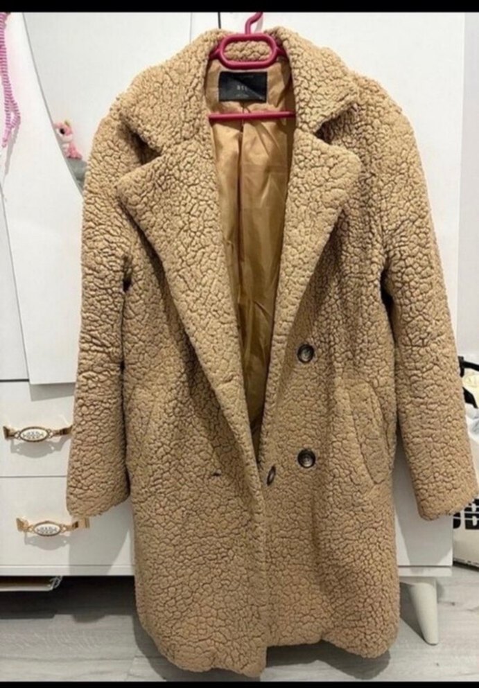 Kahverengi midi uzunlukta, peluş kumaştan yapılmış kadın kaban. Uzun kollu, yakalı ve kürk detaylı, rahat kesimle günlük sokak stiline uygun.