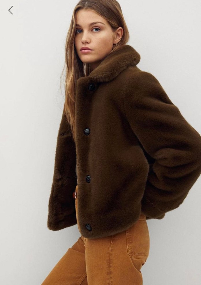 Kahverengi, diz boyu, peluş görünümlü, notched lapel yaka ve uzun kollu kadın mont. Salaş kesim, desensiz, rahat günlük kullanım için uygun.