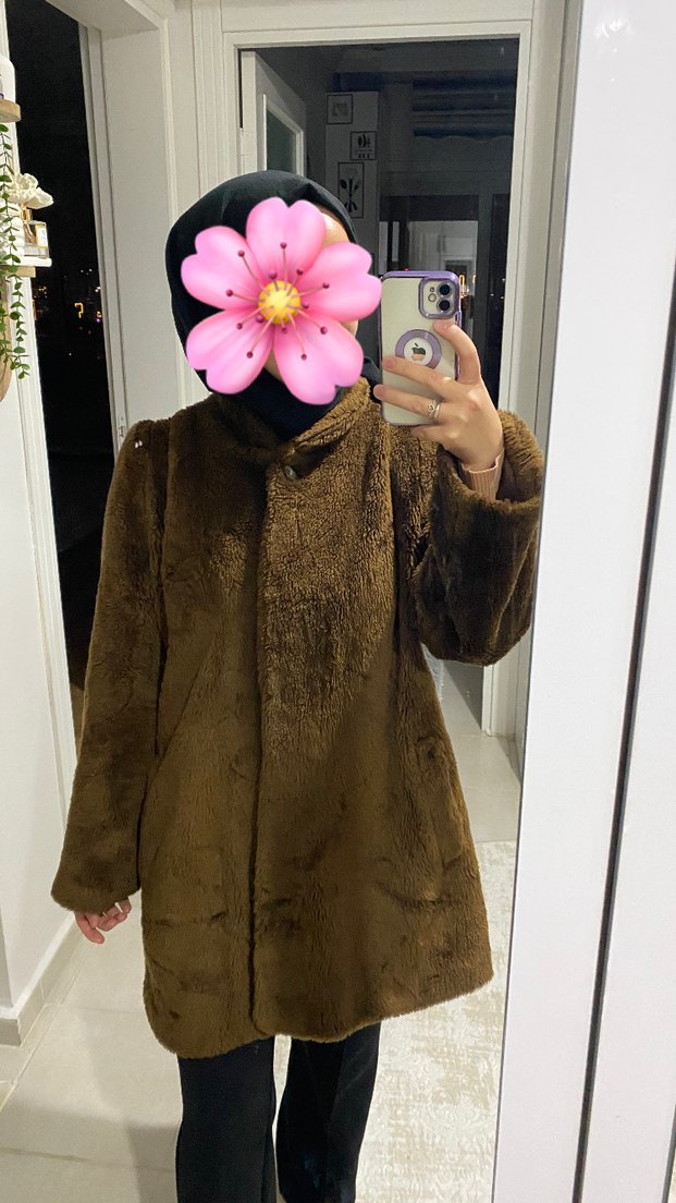 Kahverengi midi boy, yüksek yakalı ve uzun kollu suni kürk kaban. Rahat, bol kesimli ve günlük kullanıma uygun sıcak dokulu kumaş.