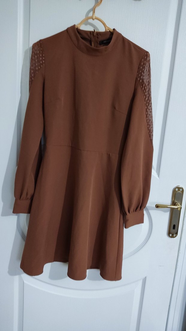 Kahverengi midi elbise, uzun kollu ve omuzlarda ince tül detaylıdır. Yüksek yakalı, bol kesimdir. Ofis kullanımı için uygundur. Rengi kahverengi Taba arası tatlı bir ton.