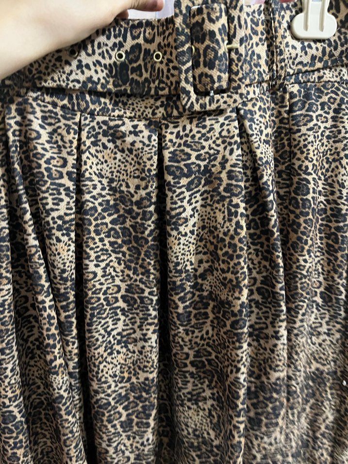Sentetik kumaştan üretilmiş, kahverengi yılan desenli ve kürk detaylı bol kesim midi hamile eteği. Günlük kullanıma uygun, sokak modası tarzında. Hiç giyilmedi bilekte