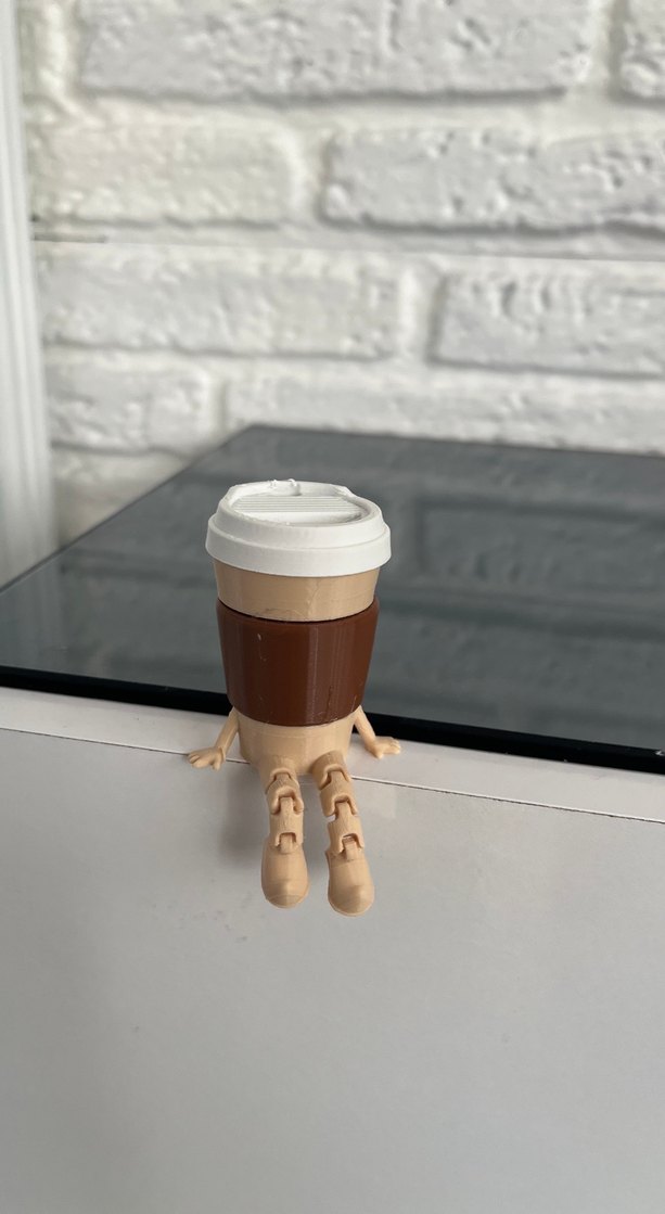 Kahverengi kahve fincanı şeklinde küçük aksiyon figürü, hareketli bacaklara sahip. ☕