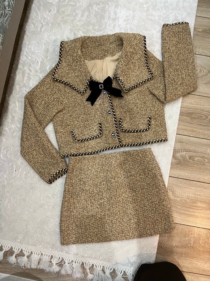Kahverengi örgü dokusu, kısa mini etek ve uzun kollu, yakalı ceketle klasik Paris tarzında, ofis için uygun kadın takımı. Nakış detaylı. Eteğin astarı şort şeklinde. Temadan aldım ve bir kez bile giymedim bedeni olmadı.