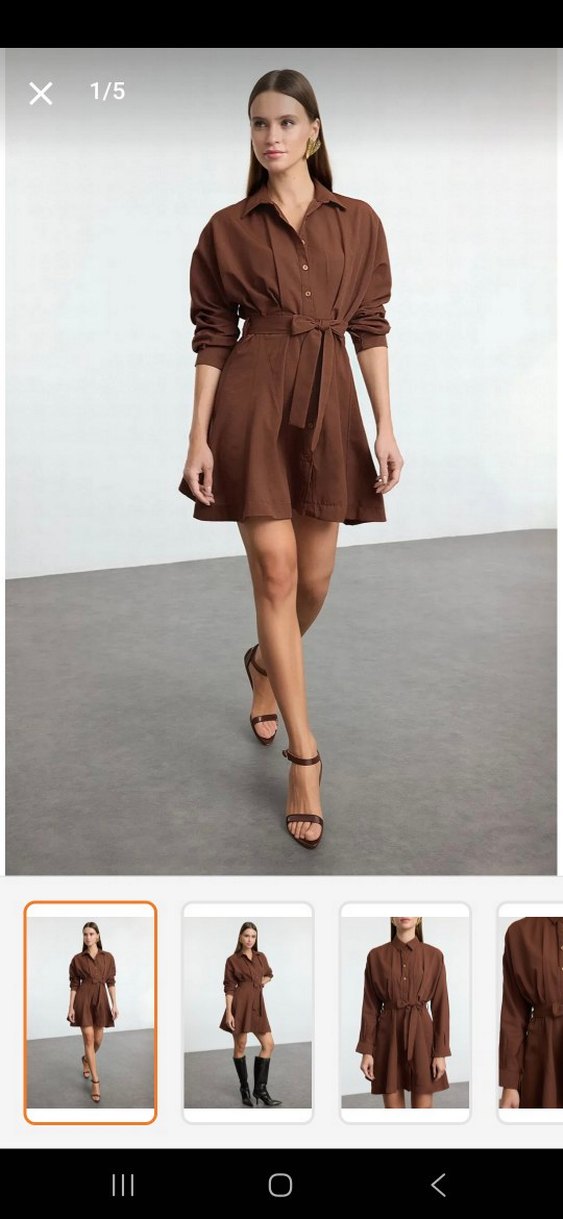 Kahverengi mini elbise, kemerli bel . V yaka ve desensiz tasarımıyla günlük kullanıma uygundur.
