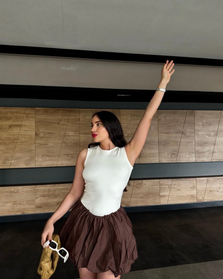 Kahverengi mini elbise, kolsuz tasarımıyla dikkat çeker. Düz ve hafif renk tonu, parti için zahmetsiz şıklık sunar. S/M/L BEDENLERİ MEVCUT
