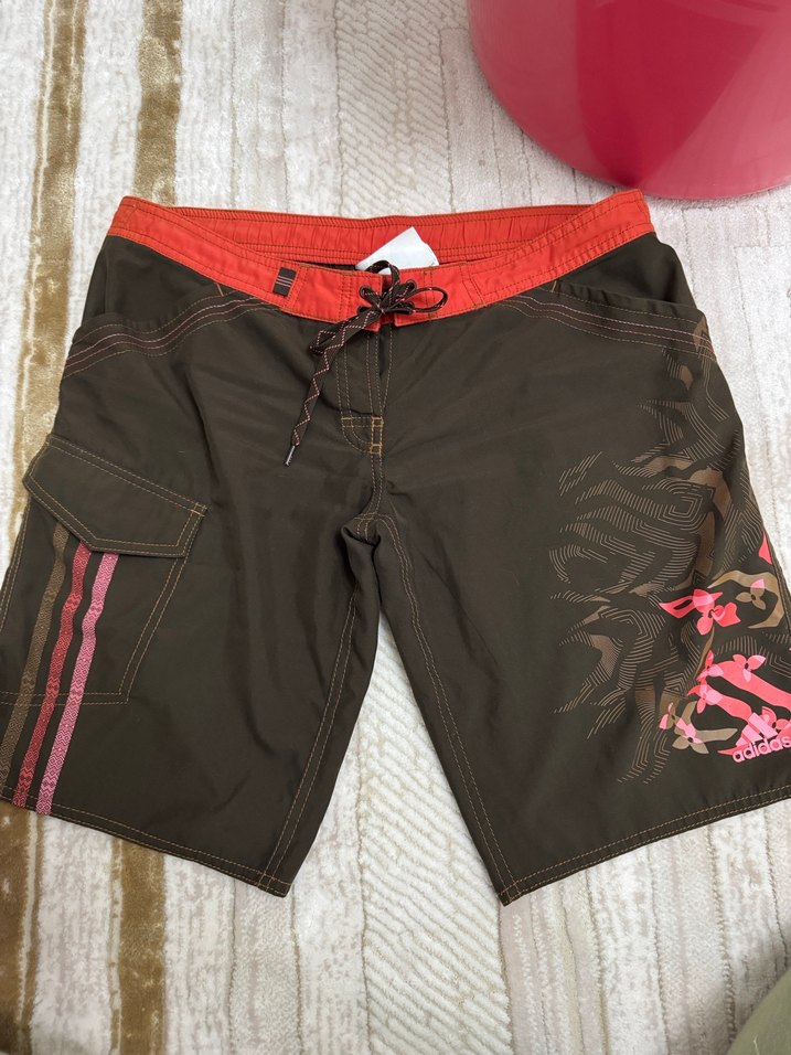 Kahverengi erkek deniz şortu, kırmızı kemerli ve bol kesimli. Yan cepli ve grafik detaylı, plaj için uygun. Bir kusuru yoktur. Orijinaldir