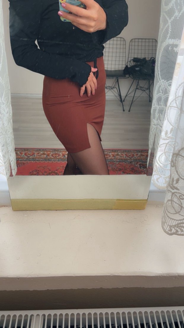 Bu kahverengi süet mini etek, yırtmaçlı ve çağdaş minimalist tasarıma sahip, cesur romantik akşamlar için ideal.