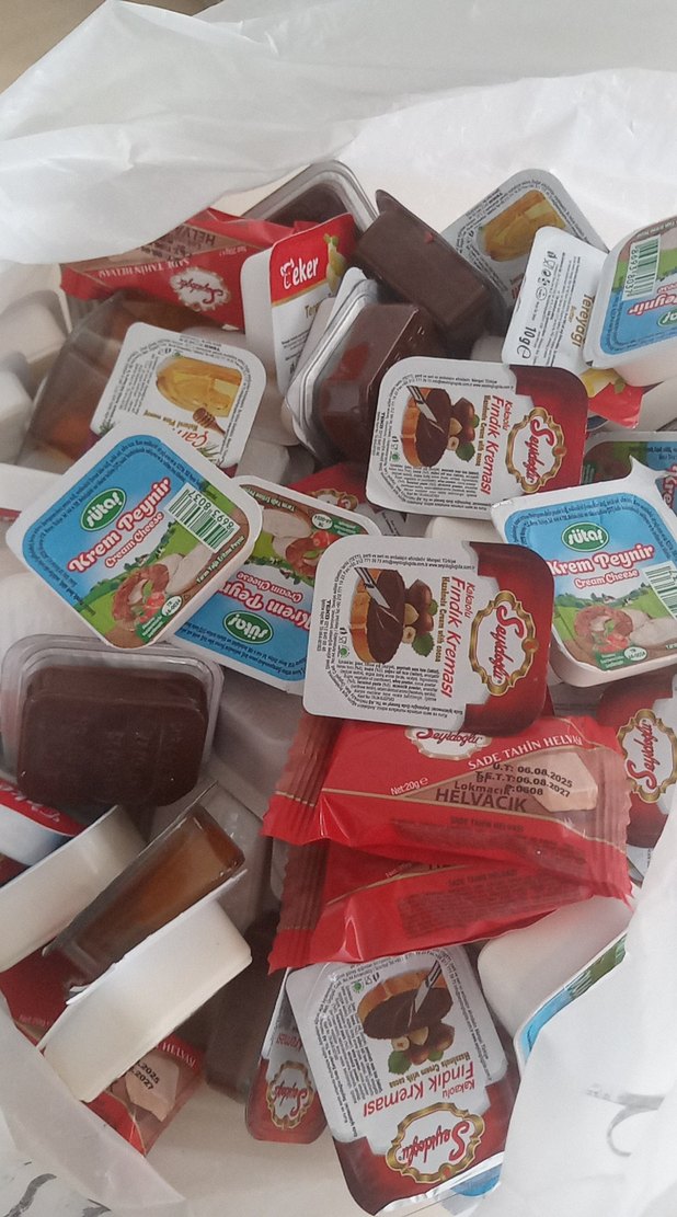Kahverengi mini gıda kapları, krem peynir ve çikolata kreması gibi çeşitli sürülebilir ürünlerle dolu. Tek porsiyon için uygundur. bir kilo fiyatıdır almak isteyen olursa bana hemen dönüş yaparsa sevinirim elinde çok az sayıda kaldı