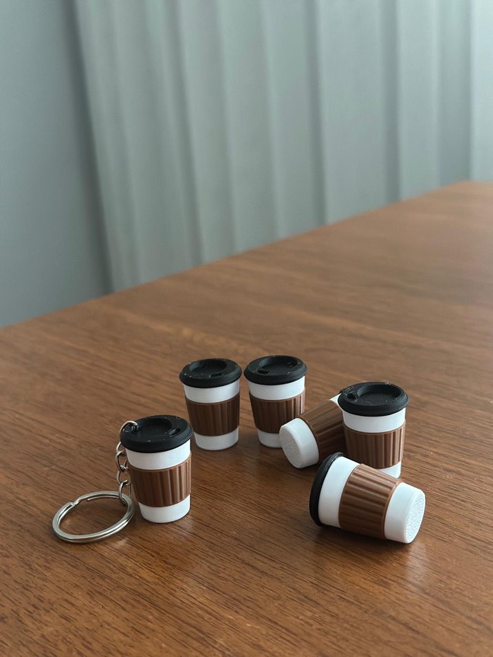 Kahverengi ve siyah kapaklı mini kahve kupası anahtarlıkları, küçük takeaway kahve fincanı şeklindedir. Dekoratif aksesuar olarak kullanılır. ☕