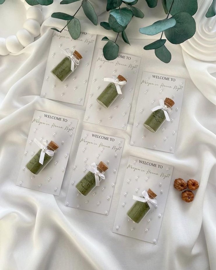 Kahverengi toz ve mantar tıpalı küçük şişeler, 'WELCOME TO' yazılı şeffaf kartlar üzerinde, dekoratif ve hediye olarak uygun . 50 adet