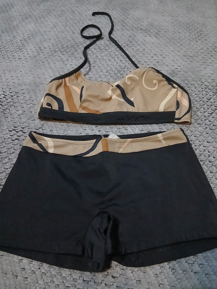 Kahverengi, askılı üst ve kısa şortlu, dış mekan sokak modasına uygun, oturaklı ve şık mini bikini takımı. bır kere kullanıldı artık olmadığından satışta