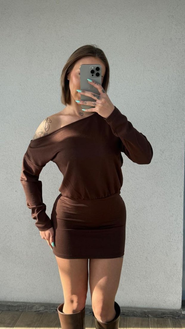 Koyu kahverengi, düz renkli, oysho kumaştan yapılmış, uzun kollu ve straplez kesime sahip sıkı oturan mini elbisedir. Rahat ve şık bir günlük sokak stili sunar. 36 38 40 bedenleri mevcuttur