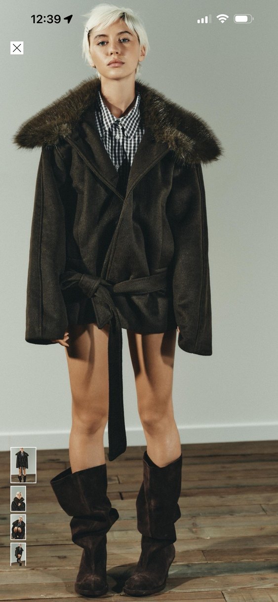 Kahverengi süet mini kaban, bol kesim ve kesik yakaya sahip. Kürk detaylı yakası ve askılı kollarıyla rahat ve şık bir tarz sunar.