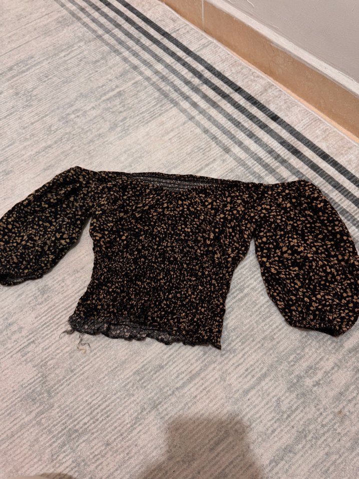 Dar kesim, kısa uzunlukta kadın bluz, tekne yaka ve uzun kolludur. Yumuşak sentetik kumaştan yapılmış, rahat triko dokusu ve koyu kahverengi desenlidir, trend sokak stili için uygundur.