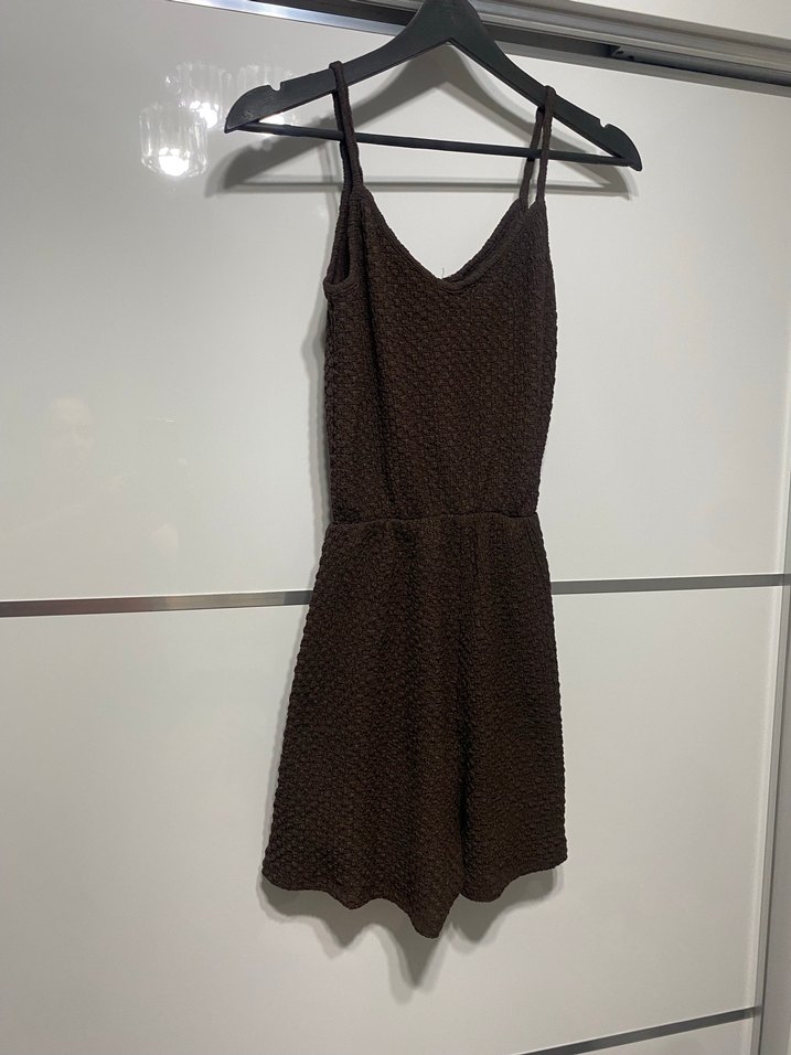 V yaka ve ince askılı, kahverengi triko mini tulum Minimalist ve bohem tarzıyla günlük kullanıma uygun, yumuşak triko kumaştan yapılmıştır.