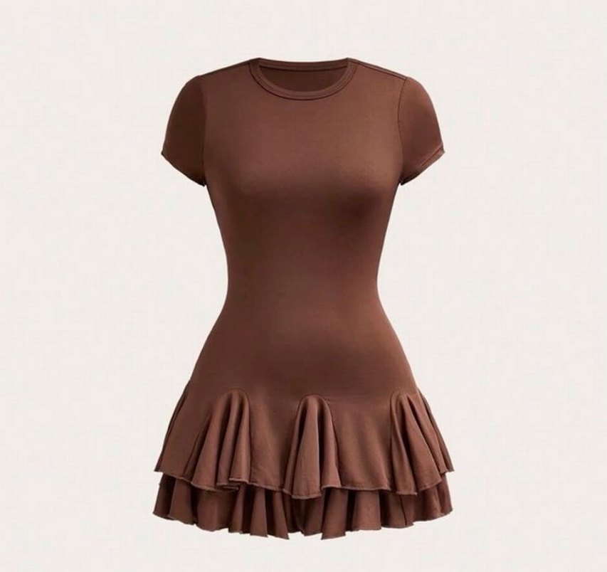 Kahverengi, kısa kollu, kruvaze yaka ve volan detaylı, vücuda oturan mini elbise. Sentetik kumaştan, cesur sokak stili için uygun.
