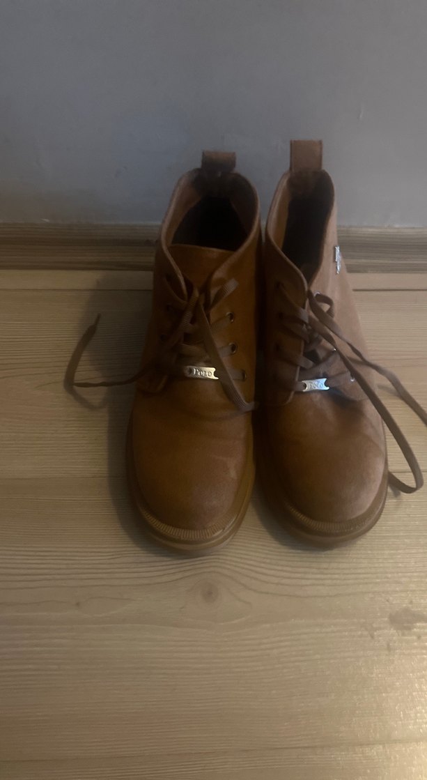Parlak kahverengi minimalist erkek botları, tokalı ve bağcıklı detaylara sahip, sokak stiline uygun. Düz ve desensiz yüzeylidir.