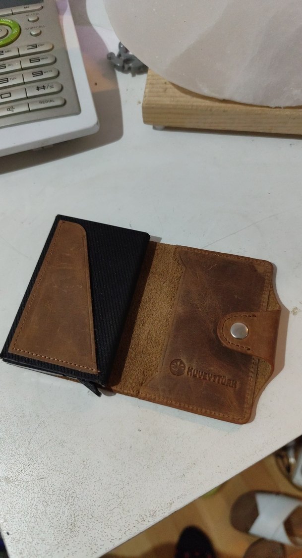 Kahverengi, desen içermeyen minimalist erkek cüzdanı, deri ve kumaş karışımı malzeme ile çıtçıtlı kapama sunar. Kompakt ve işlevsel tasarıma sahiptir.