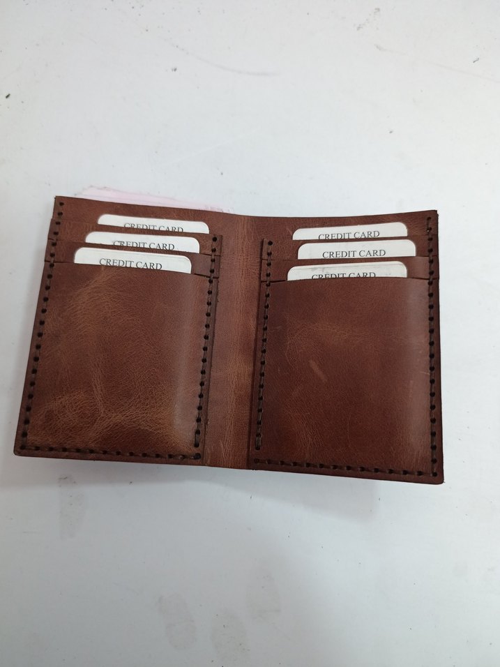 Kahverengi erkek cüzdan, minimalist tasarıma sahip, çoklu kart yuvaları ve parlak yüzey içerir. Basit ve desensiz şık bir modeldir.