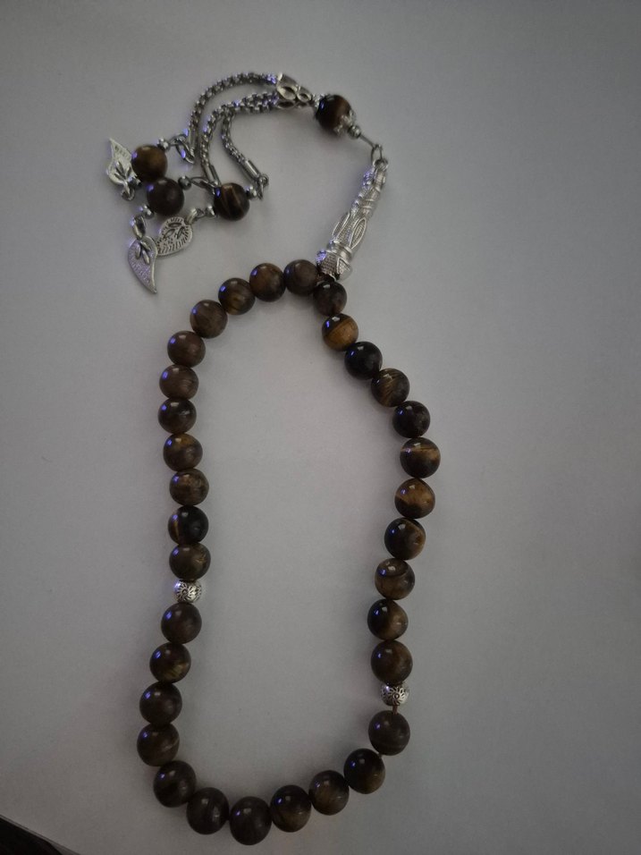Koyu kahverengi, yuvarlak boncuklardan oluşan, minimalist ve bohem tarzda erkek tesbih. Gümüş tonlu detaylar içerir. kaplan gözü taş, hiç kullanılmadı, tesbih ve bileklikten oluşuyor, hacdan geldi, 2 adet gümüş boncuk içerir
