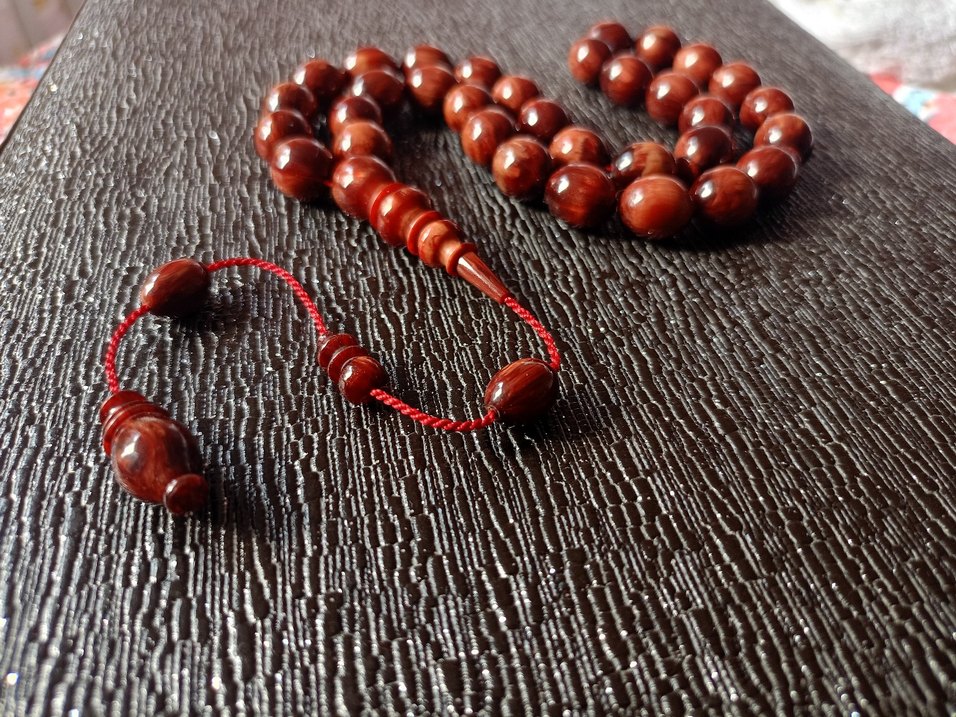 Koyu kahverengi, minimalist tasarımlı klasik erkek tespihi, kırmızı ip üzerinde parlak yuvarlak boncuklarla.