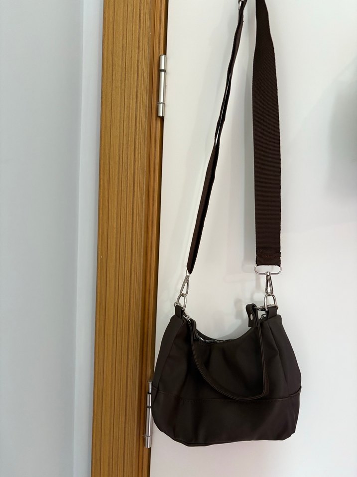 Koyu kahverengi, tokalı ve ayarlanabilir askılı kadın çantası. Sentetik kumaştan, minimalist ve günlük kullanıma uygun.