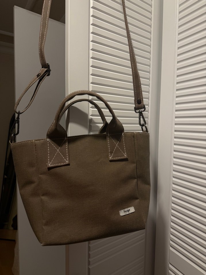 Kahverengi, tokalı, hem elde hem omuzda taşınabilen ayarlanabilir askılı kadın çantası. Yumuşak sentetik kumaştan, minimalist ve desensiz tarzda, günlük kullanıma uygun.
