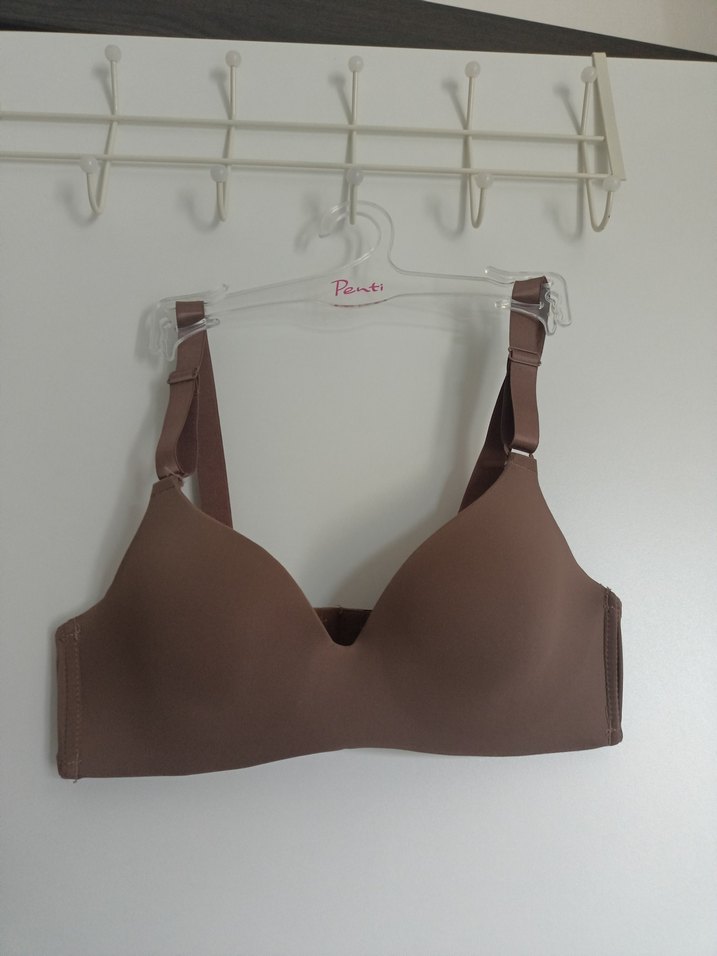Bu koyu bej sütyen, minimalist tasarımı ve deseniz düz kumaşıyla dikkat çeker. Normal uzunlukta, ayarlanabilir askılara sahiptir. Günlük sokak stili için uygundur. Dolgusuzdur. Belki bir-iki kez kullanılmıştır.