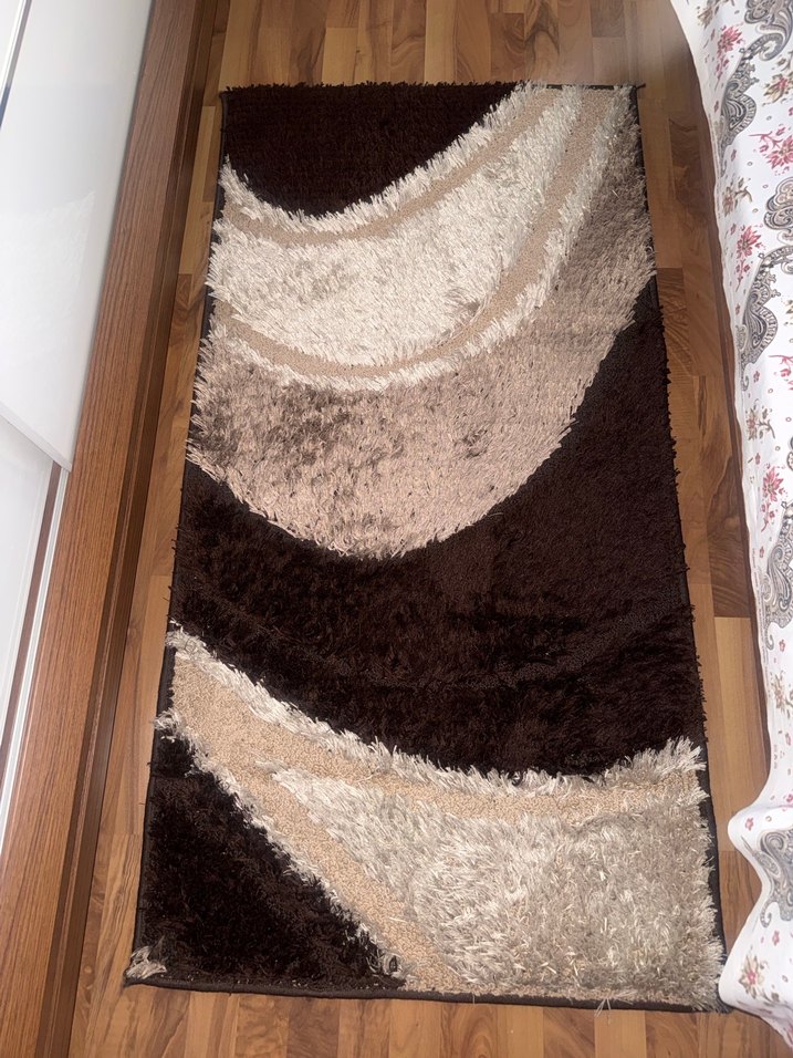 Kahverengi tonlarda, bej ve krem dalgalı desenlere sahip modern tarzda, yumuşak dokulu halı. Tane fiyatıdır !
