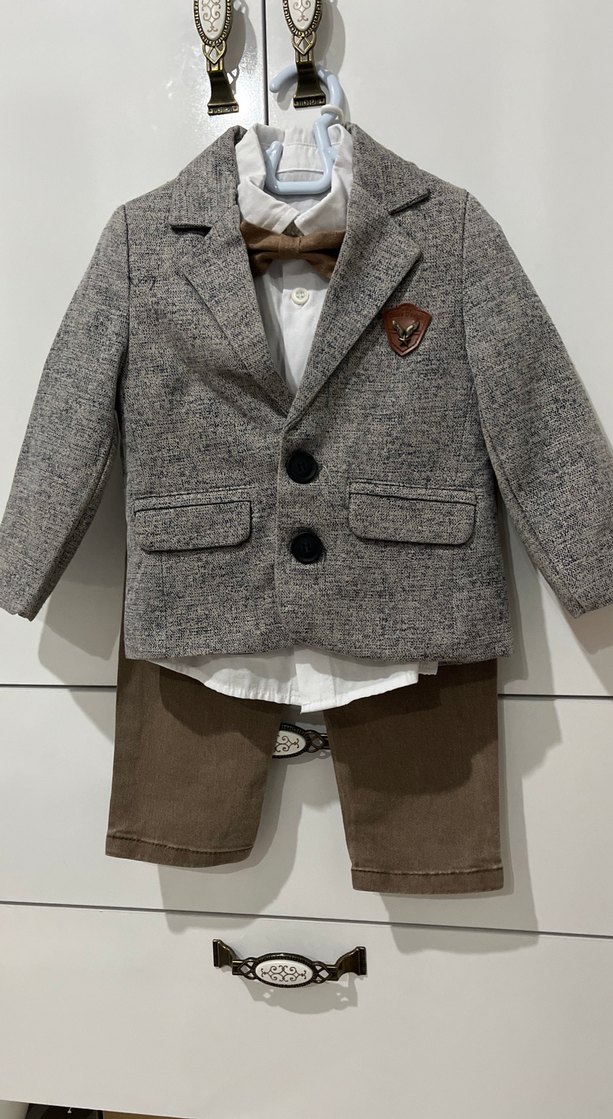 Gri yakalı düğmeli ceket, beyaz gömlek, kahverengi papyon ve pamuklu kahverengi pantolondan oluşan modern klasik bebek erkek takımı.
