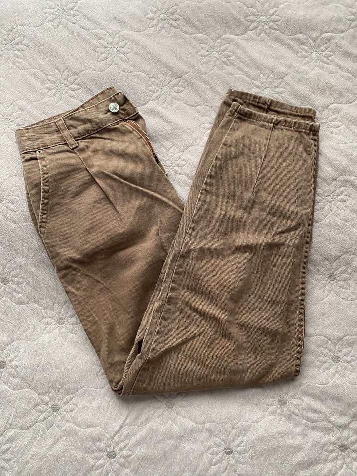 Kahverengi, düğmeli kot kadın pantolon. Mom jean model ama rahat ve bol kesimi ve bilekte boyuyla gündelik kullanıma uygundur. 160 cm boyundayım ve paçası bileğimde. Herhangi bir deformasyonu hasarı yoktur