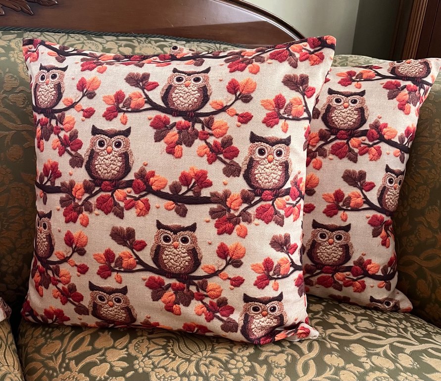 Tane fiyatıdır..Bohem tarzda, koyu kahverengi tonlarda, nakışlı baykuş ve sonbahar yaprakları desenli yumuşak kumaş yastık.