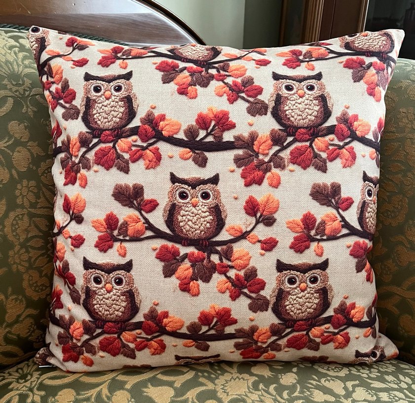 Tane fiyatıdır.. Kahverengi tonlarda nakışlı baykuş ve sonbahar yapraklarıyla süslenmiş bohem tarzda yastık kılıfı. Kırlent. Detaylı işleme, mekâna sıcaklık katar.