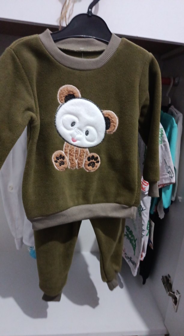 Uzun kollu, bisiklet yaka bebek erkek takımı, yumuşak ve sıcak kumaştan, kahverengi ve gri tonlarda nakışlı panda figürlü ve kürk detaylıdır.