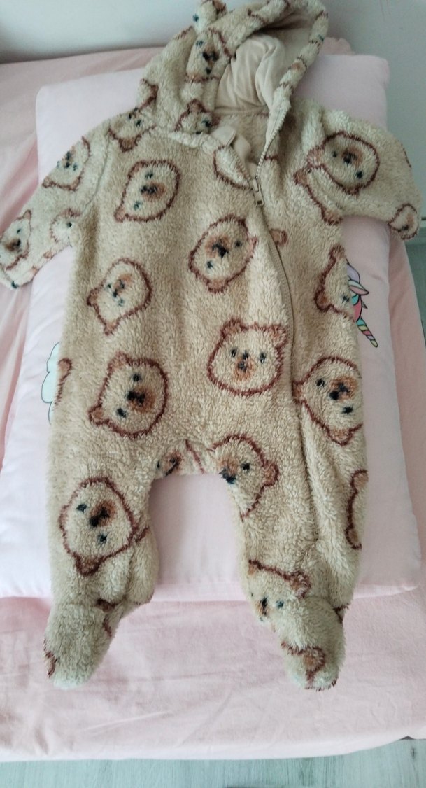 Yumuşak ve sıcak kahverengi bebek tulumu, nakışlı ayı yüzleriyle tasarlanmıştır. Küçükleri rahat tutmak için uygundur.