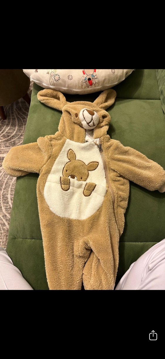 Kahverengi, yumuşak ve sıcak kumaştan yapılmış, kürk detaylı ve nakışlı hayvan desenli bebek tulumu. Kapüşonlu ve kulaklı, sokak stili.