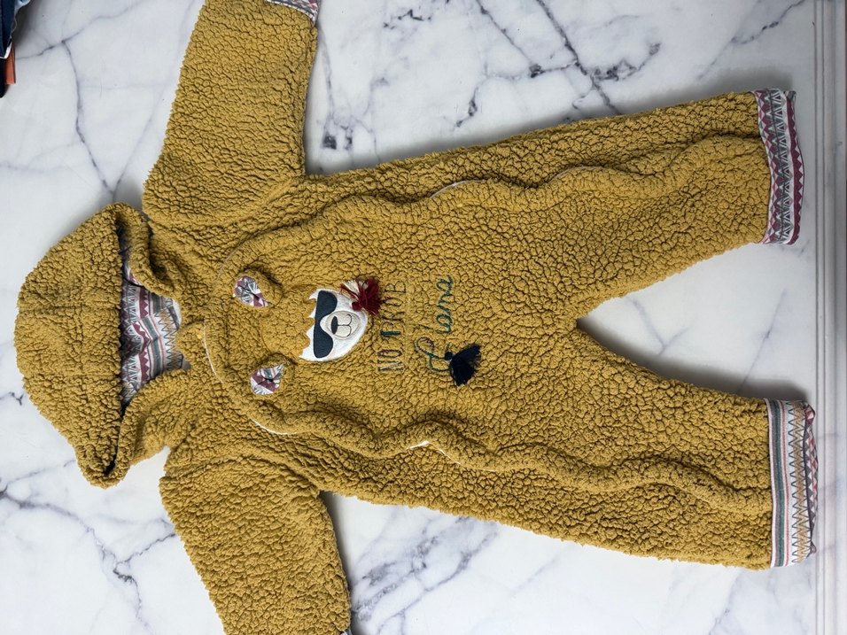 Kahverengi, yumuşak ve sıcak kumaşlı bebek tulumu, renkli nakışlı detaylar ve kürk süslemeler içerir. Yenidoğan bebeklerde battaniye gerek kalmadan mont niyetine içine koyup dışarı çıkartabilir siniz ben o şekilde kullanmıştım büyük rahatlık