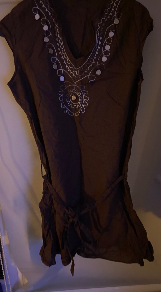 Kahverengi, nakışlı ve kemerli, V yakalı, kolsuz, dar kesim, mini şile bezi plaja uygundur.