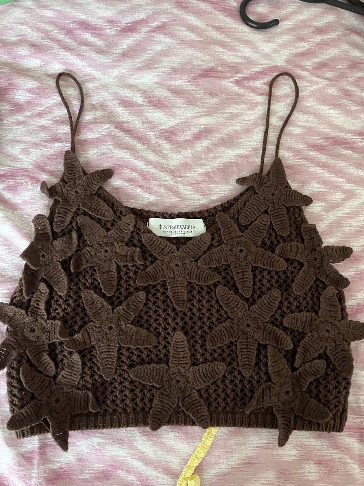 Kahverengi, nakışlı denizyıldızı desenli, ince askılı ve bohem tarzda rahat bir bralet.