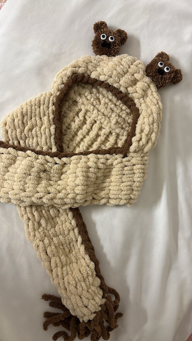 Nakışlı detaylara sahip kahverengi ve gri tonlarında bohem tarzda örme çocuk bere ve atkı seti.