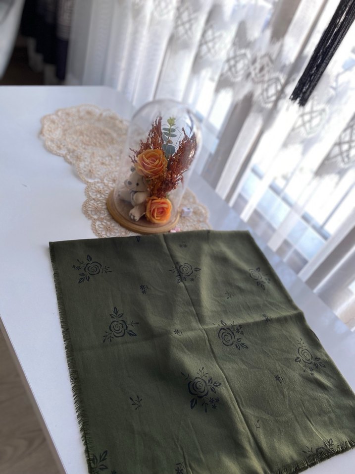 Koyu kahverengi, nakışlı çiçek desenleriyle bohem tarzda eşarp doğal bir dokunuş katıyor.