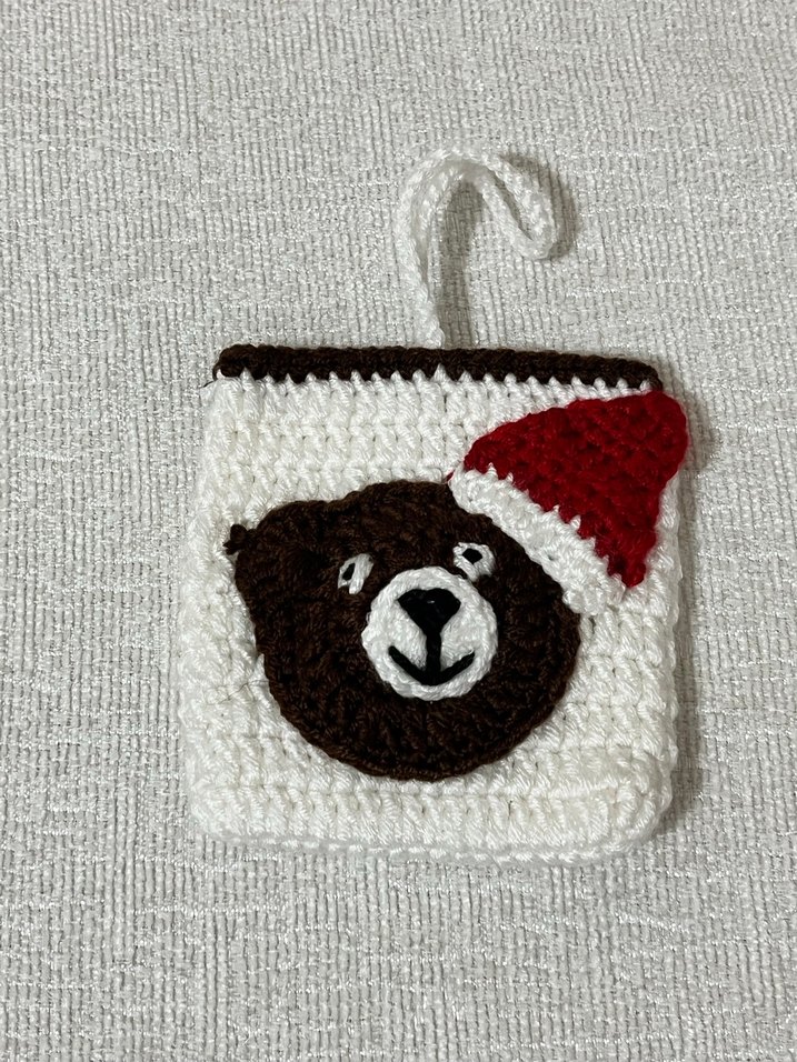 Kahverengi nakışlı ayı yüzü ve kırmızı Noel şapkası detaylı beyaz fırın eldiveni. Asma halkası bulunmaktadır.
