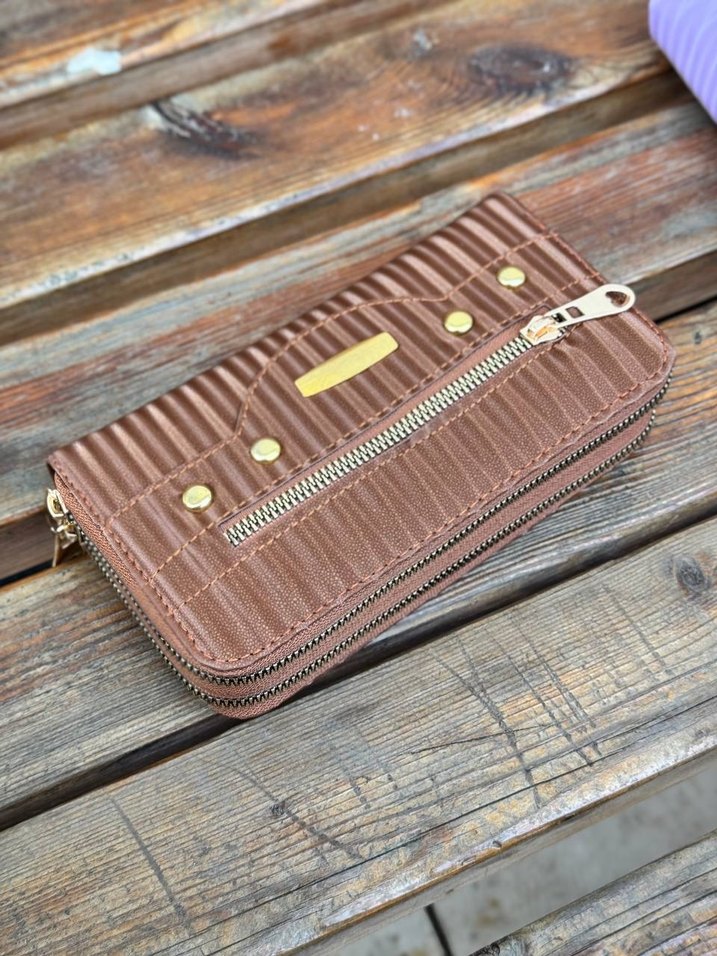 Kahverengi deri, parlak nakışlı ve fermuarlı kapamalı kadın cüzdanı. Vintage ve biker tarzını günlük kullanıma uygun şekilde birleştirir. 34522