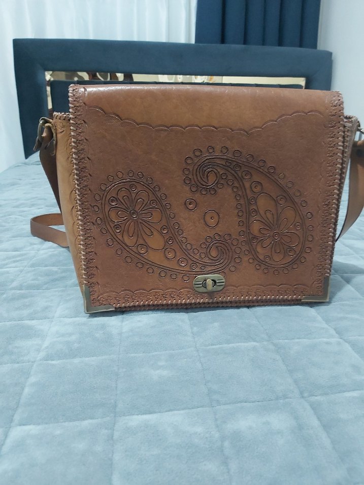 Kahverengi Nakışlı Deri Kadın Çapraz Çanta