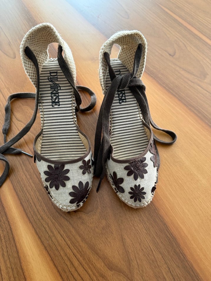 Nakışlı çiçek desenli, bağcıklı bilek bantlı kahverengi dolgu topuklu espadriller, günlük kullanıma uygun bohem tarzda.Hiç kullanılmadı kusursuz Made in spain
