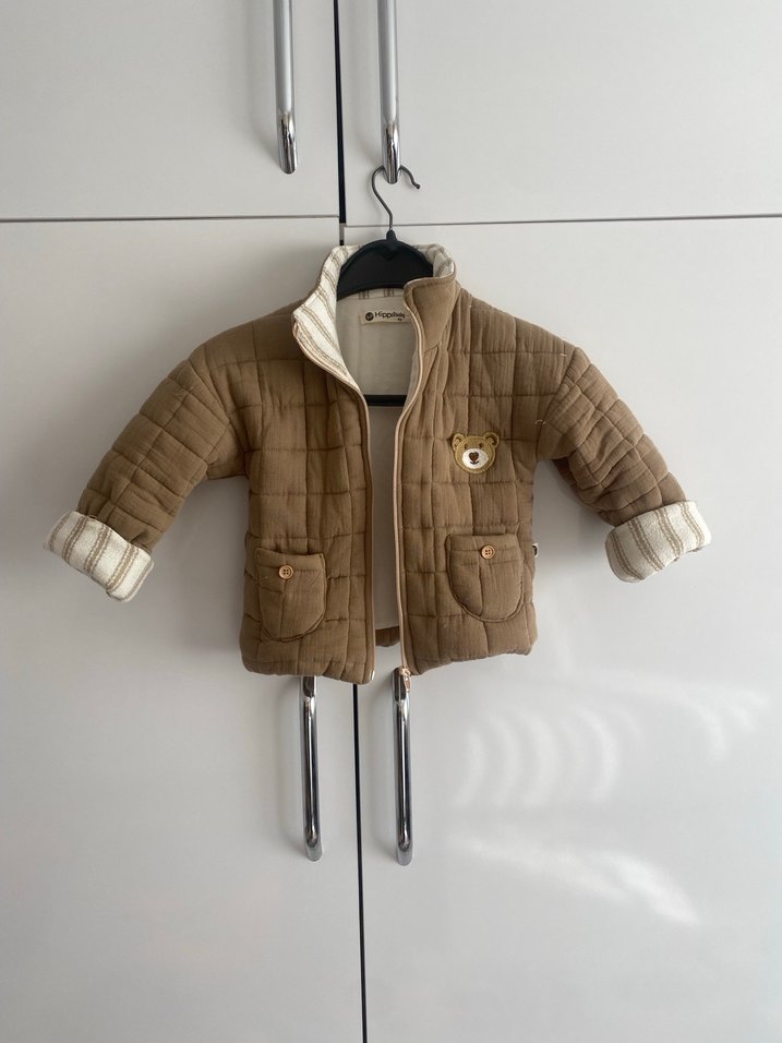Erkek çocuk ceketi, nakışlı ayı detaylı ve cep düğmeli. Yumuşak, sıcak kumaş ve kürk detaylı, rahat bol kesim.