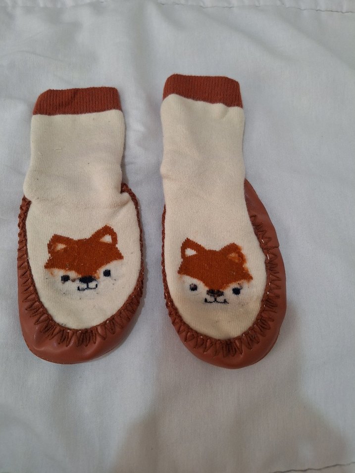 Kahverengi, renkli nakışlı tilki yüzü desenli erkek çocuk çorabı, yumuşak tabanlıdır. Rahat ve sevimli bir tasarım.