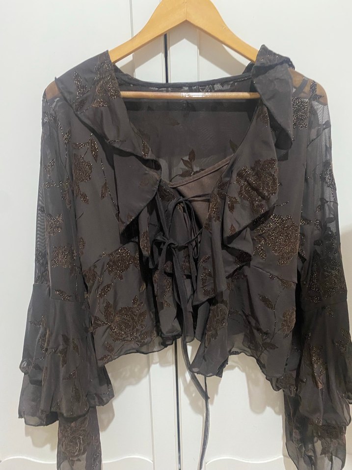 Kahverengi, nakışlı desenlere ve fırfır detaylarına sahip, uzun kollu, V yakalı, bol kesim bluz. İpeksi dokuda, ofis kullanımı için uygun. ikili üst . İçerisinde üste ait atlet bulunmakta . Sadece bir kez giyildi