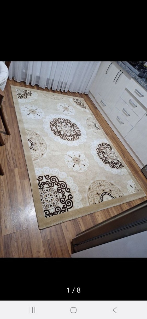 Açık kahverengi, nakışlı çiçek desenleriyle geleneksel tarzda, dekoratif ve yumuşak bir halı.