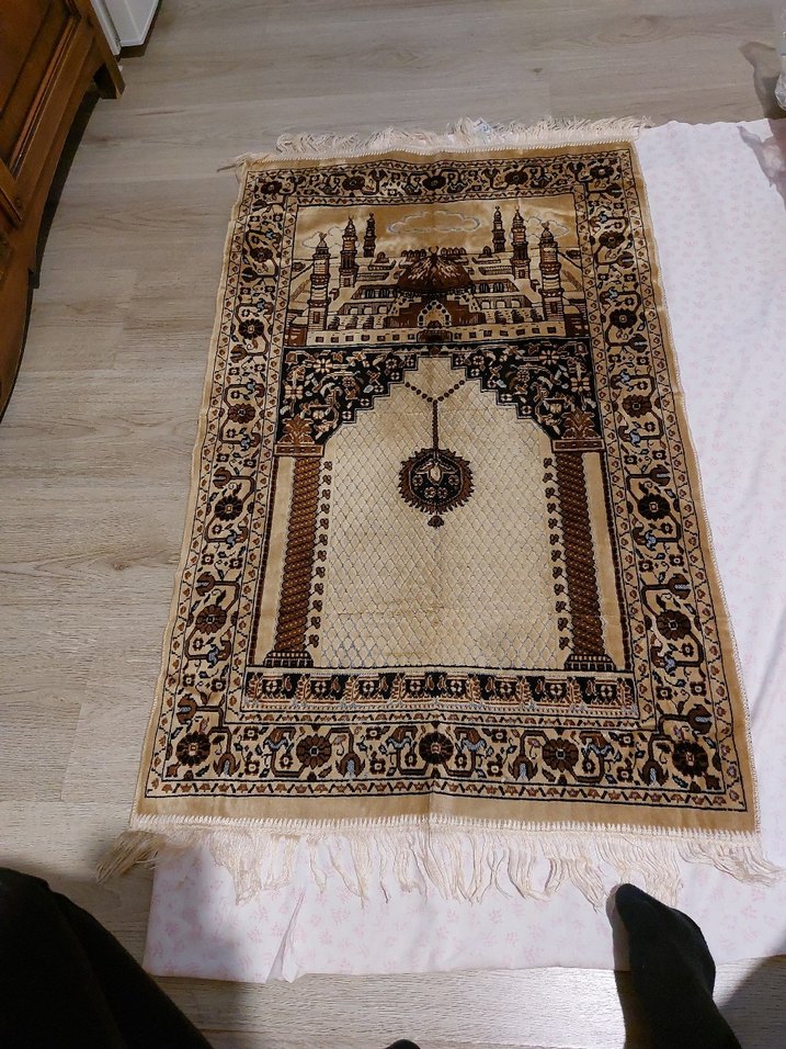 Koyu kahverengi, nakışlı desenlere ve püsküllü kenarlara sahip geleneksel halı, klasik bir dokunuş sunar.
